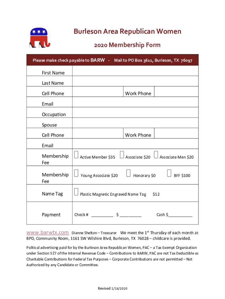 Burleson Area Republican Women 2020 Membership Form Please make check payable to BAR Mail to PO Box 3611, Burleson, TX 76097First Name Last Name Cell Homework Phonemic Occupation Spouse Cell Homework