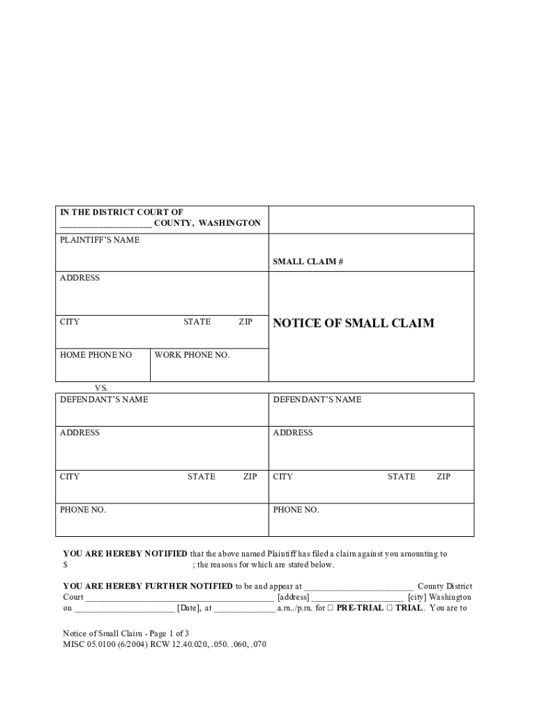 IN THE DISTRICT COURT OF COUNTY, WASHINGTON PLAINTIFFS NAME SMALL CLAIM # ADDRESSCITYHOME PHONE NOSTATEZIPNOTICE OF SMALL CLASSWORK PHONE NO.VS. DEFENDANTS NAMEDEFENDANTS NAMEADDRESSADDRESSCITYSTATEZIPPHONE