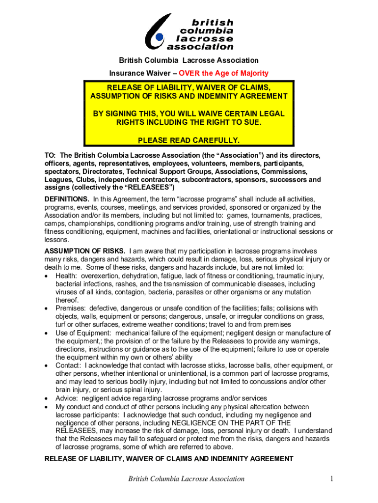 British Columbia Lacrosse Association Insurance Waiver OVER the Age of Majority RELEASE OF LIABILITY, WAIVER OF CLAIMS, ASSUMPTION OF RISKS AND INDEMNITY AGREEMENT BY SIGNING THIS, YOU WILL WAIVE