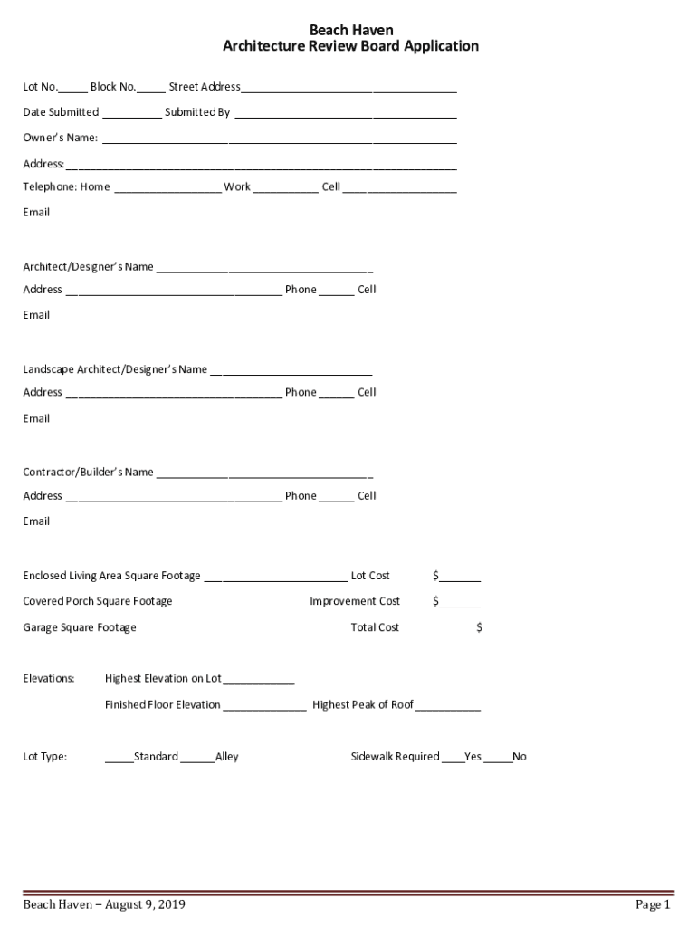 Beach Haven Architecture Review Board Application Lot No. Block No. Street Address Date Submitted By Owners Name: Address: Telephone: Homework Cell EmailArchitect/Designers Name Address Phone Cell