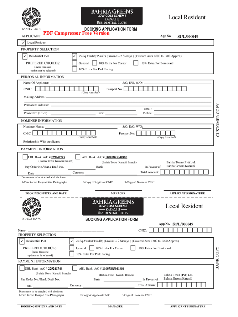 APPLICANT9PDF Compressor Free Version No. S1/L/000049Local ResidentPROPERTY SELECTION99Residential PlotPREFERED CHOICES:75 Sq. Yards/(\'15×40\') (Ground + 2 Stories) (Covered Area