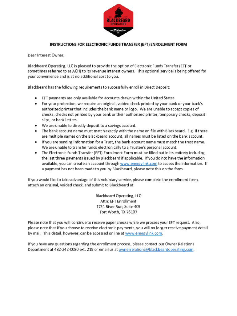 INSTRUCTIONS FOR ELECTRONIC FUNDS TRANSFER (EFT) ENROLLMENT FORM Dear Interest Owner, Blackbeard Operating, LLC is pleased to provide the option of Electronic Funds Transfer (EFT or sometimes referred