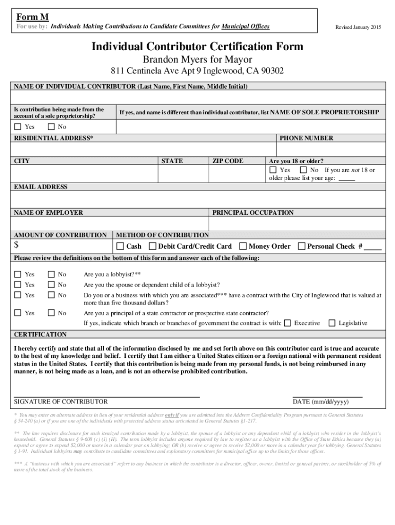 For use by: Individuals Making Contributions to Candidate Committees for Municipal OfficesRevised January 2015Individual Contributor Certification Form