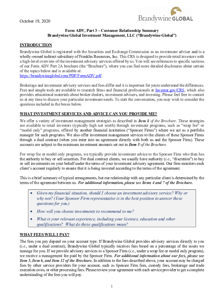 October 19, 2020, Form ADV, Part 3 Customer Relationship Summary Brandywine Global Investment Management, LLC (Brandywine Global) INTRODUCTION Brandywine Global is registered with the Securities and