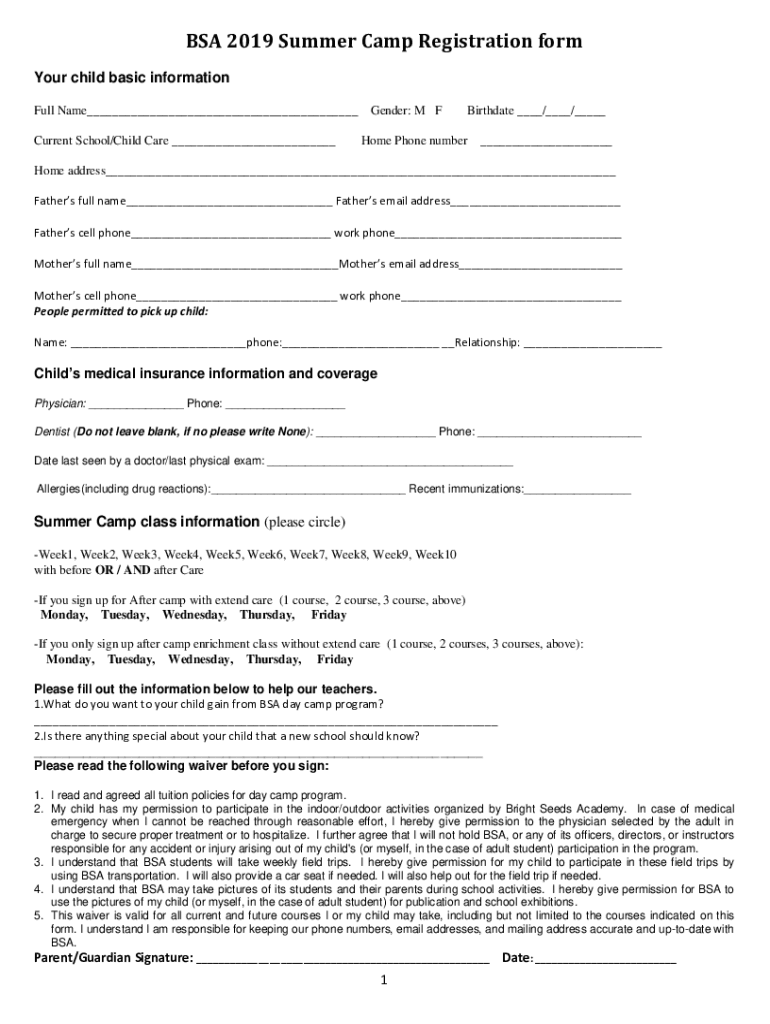 Get the free BSA 2019 Summer Camp Registration form - Bright Seeds Academy
