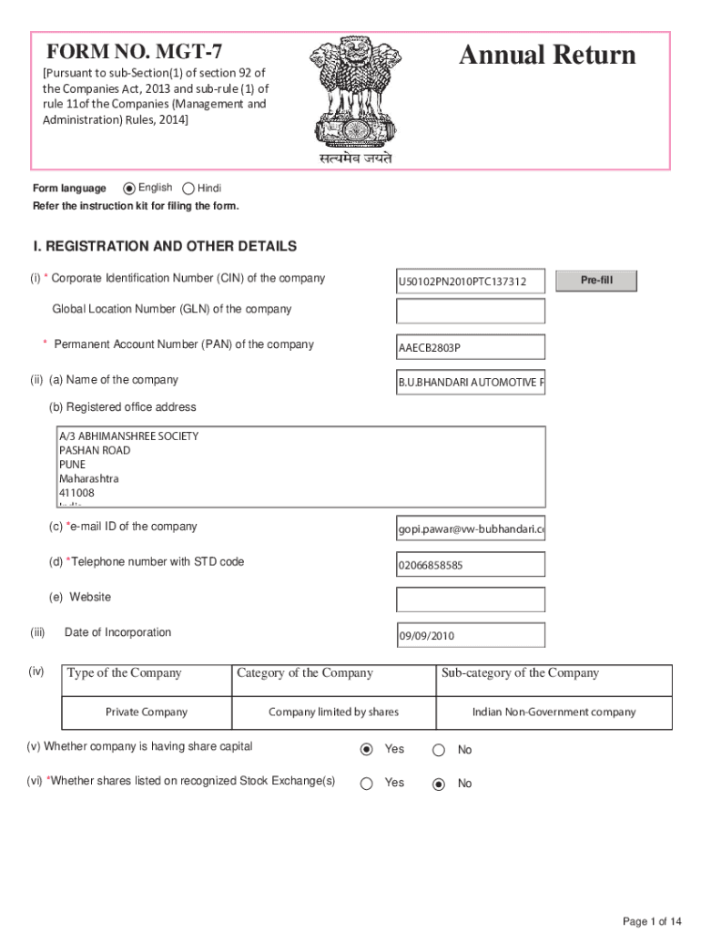 Annual Returner NO. MGT7 Pursuant to subSection(1) of section 92 of the Companies Act, 2013 and subrule (1) of rule 11of the Companies (Management and Administration) Rules, 2014 Form languageEnglishHindiRefer