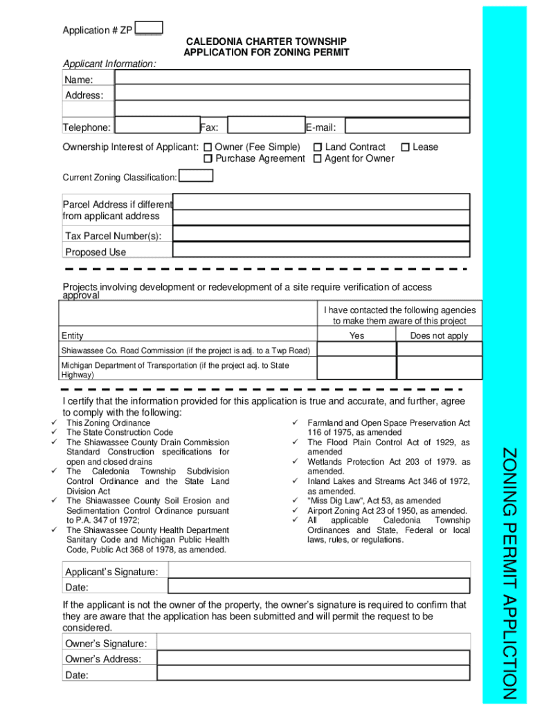 Application # UP CALEDONIA CHARTER TOWNSHIP APPLICATION FOR ZONING PERMIT Applicant Information: Na Name: Address: Telephone:Fax:Email:Ownership Interest of Applicant: Owner (Fee Simple) Land Contract