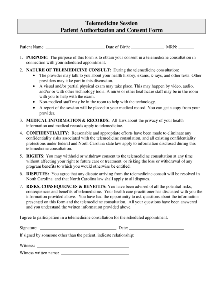 Telemedicine Session Patient Authorization and Consent Form Patient Name: Date of Birth: MAN: 1. PURPOSE: The purpose of this form is to obtain your consent in a telemedicine consultation in connection