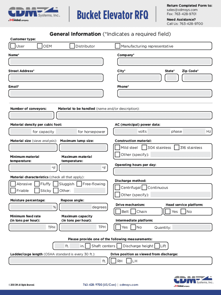 Start by gathering all the necessary information about the bucket elevator request, such as the required capacity, height, and speed.
