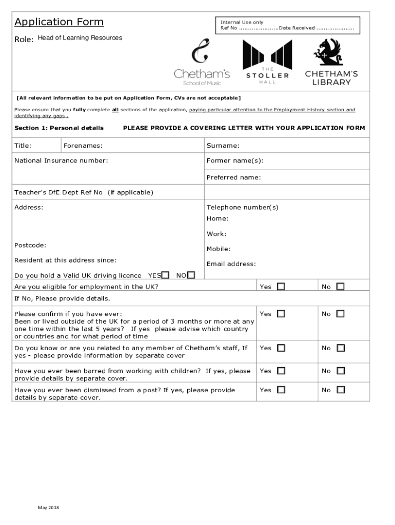 Application Form Role:Internal Use only Ref No ...................... Date Received ..................... Head of Learning Resources All relevant information to be put on Application Form, CVs are