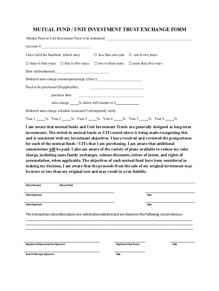 MUTUAL FUND / UNIT INVESTMENT TRUST EXCHANGE FORM Mutual Fund or Unit Investment Trust to be redeemed: Account #: I have held the fund/unit (check one): less than one year one to two years three to