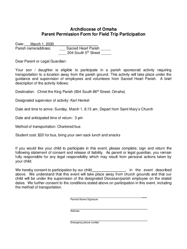 Archdiocese of Omaha Parent Permission Form for Field Trip Participation Date: March 1, 2020, Parish name/address: Sacred Heart Parish 204 South 5th Street Dear Parent or Legal Guardian: Your son