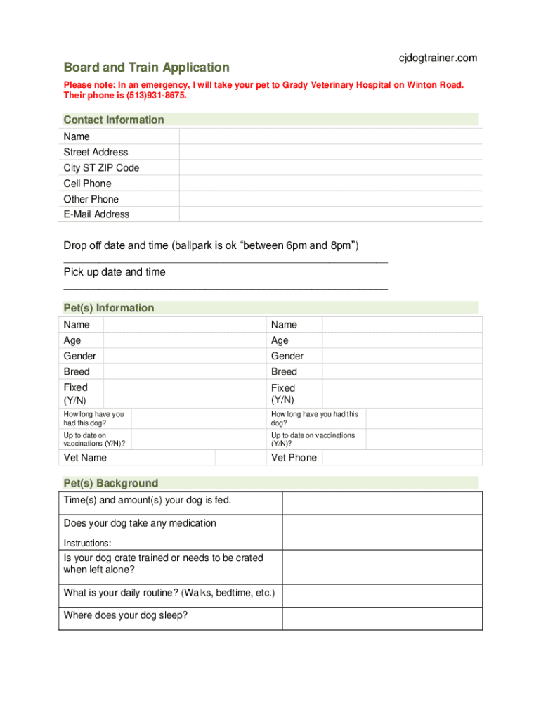 Cjdogtrainer.onboard and Train ApplicationPlease note: In an emergency, I will take your pet to Grady Veterinary Hospital on Winston Road. Their phone is (513)9318675. Contact Information Name Street