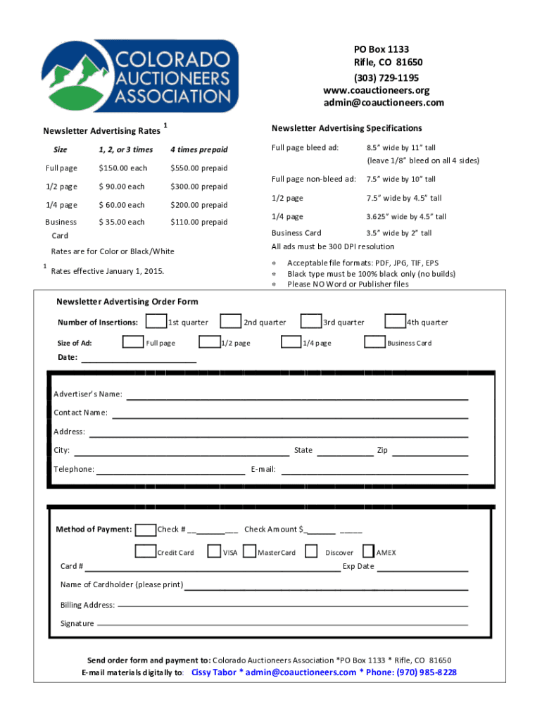 PO Box 1133Rifle, CO81650(303) 7291195www.coauctioneers.orgadmin@coauctioneers.comNewsletter Advertising RatesSize1Newsletter Advertising Specifications1, 2, or 3 times4 times prepaidFull page$150.00 each$550.00 prepaid1/2 page 90.00 each$300.00 prepaid1/4 page 60.00 each$200.00 prepaidBusiness$ 35.00 each$110.00 prepaidFull page bleed ad:(leave 1/8 bleed on all 4 sides)Careful page nonbleed ad:7.5 wide by 10 tall1/2 page7