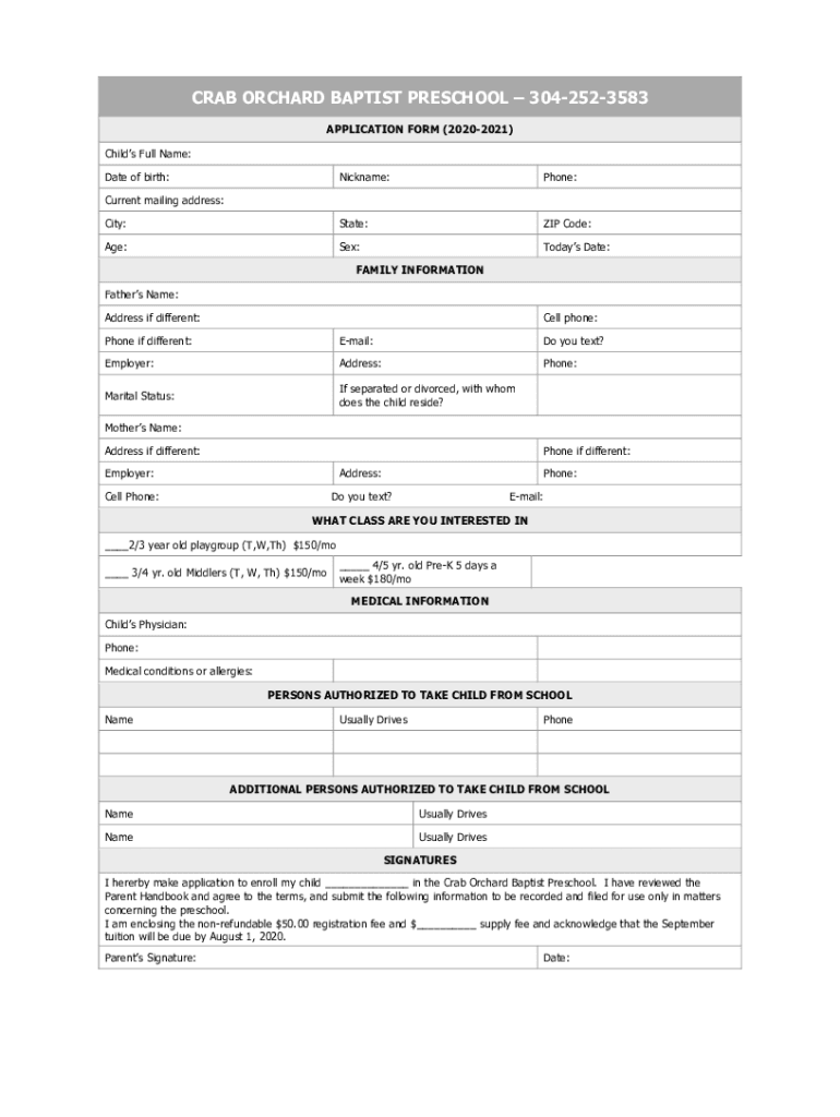 CRAB ORCHARD BAPTIST PRESCHOOL 3042523583 APPLICATION FORM (20202021) Child's Full Name: Date of birth:Nickname:Phone:City:State:ZIP Code:Age:Sex:Today's Date:Current mailing address:FAMILY INFORMATION