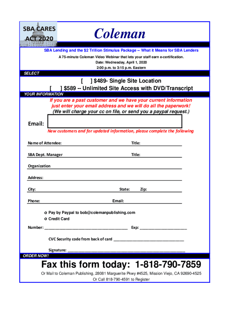 Coleman SBA Lending and the $2 Trillion Stimulus Package What it Means to SBA Lenders A 75minute Coleman Video Webinar that lets your staff earn certification. Date: Wednesday, April 1, 2020 2:00