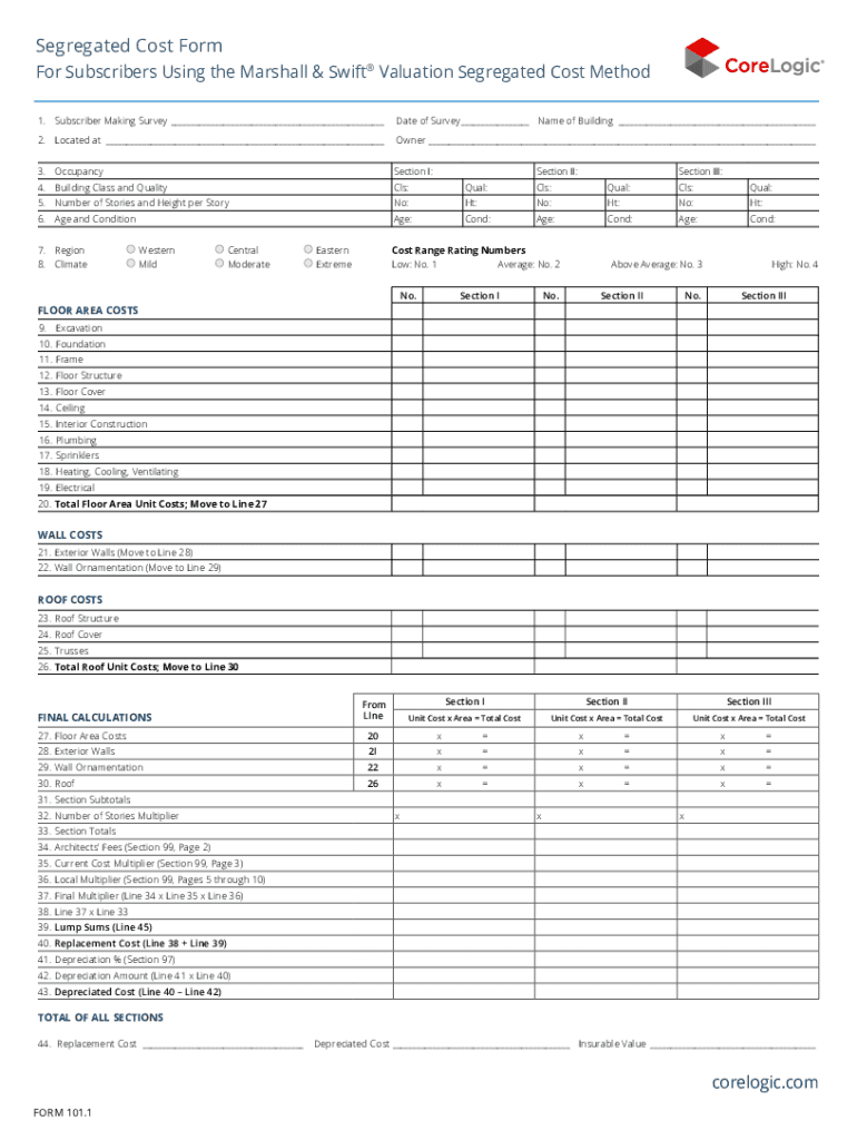 Segregated Cost Form For Subscribers Using the Marshall & Swift Valuation Segregated Cost Method 1. Subscriber Making Survey Date of Survey Name of Building 2. Located at Owner 3. OccupancySection