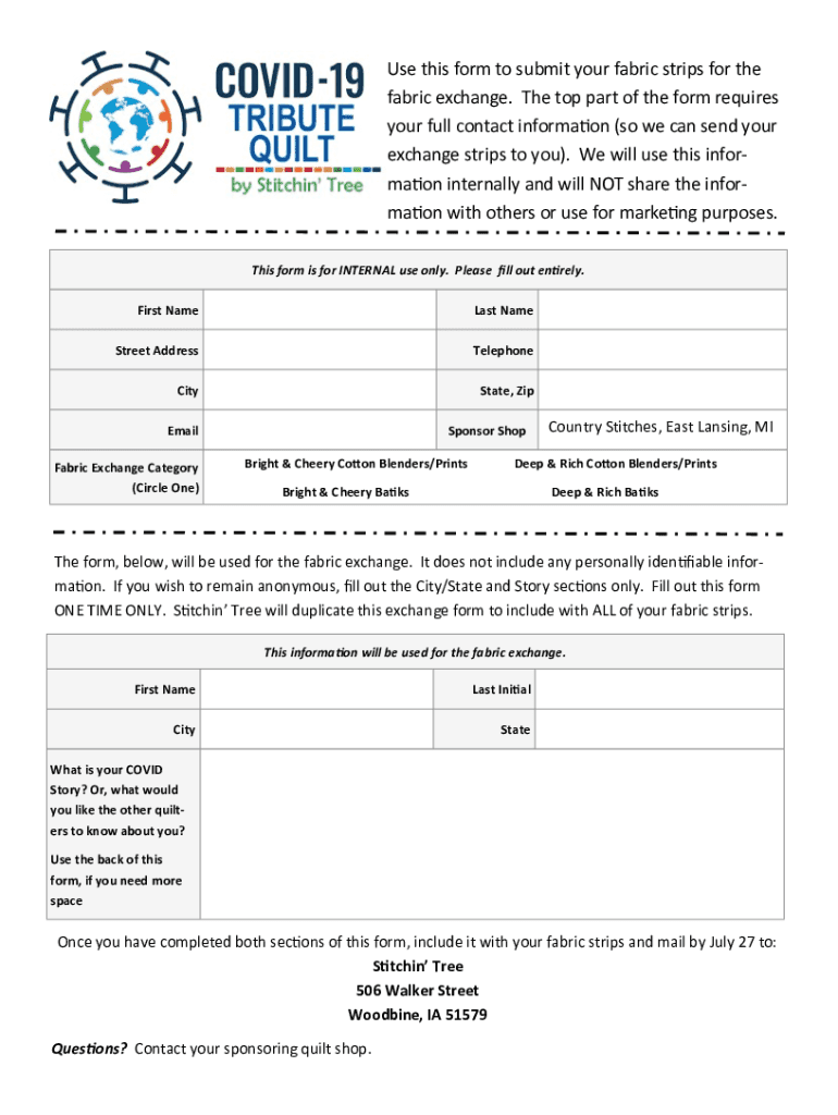 Use this form to submit your fabric strips for the fabric exchange. The top part of the form requires your full contact information (so we can send your exchange strips to you). We will use this information