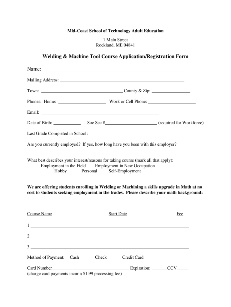Miscast School of Technology Adult Education 1 Main Street Rockland, ME 04841Welding & Machine Tool Course Application/Registration Form Name: Mailing Address: Town: County & Zip: Phones: Home: Work