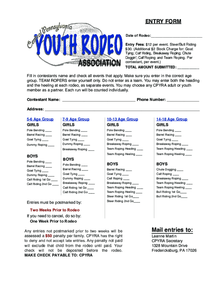 Get the free Mail entries to - Central PA Youth Rodeo Association