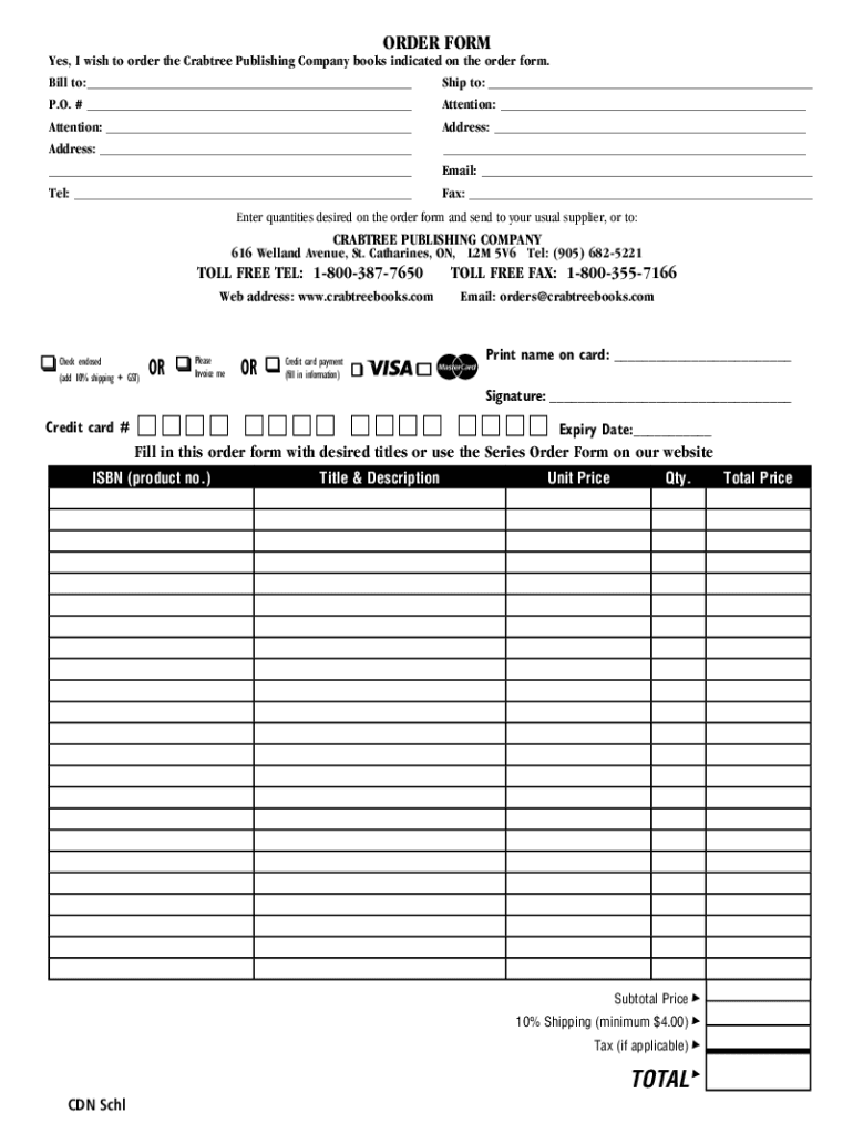 ORDER Former, I wish to order the Crab tree Publishing Company books indicated on the order form. Bill to: Ship to: P.O. # Attention: Attention: Address: Address: Email: Tel: Fax: Enter quantities