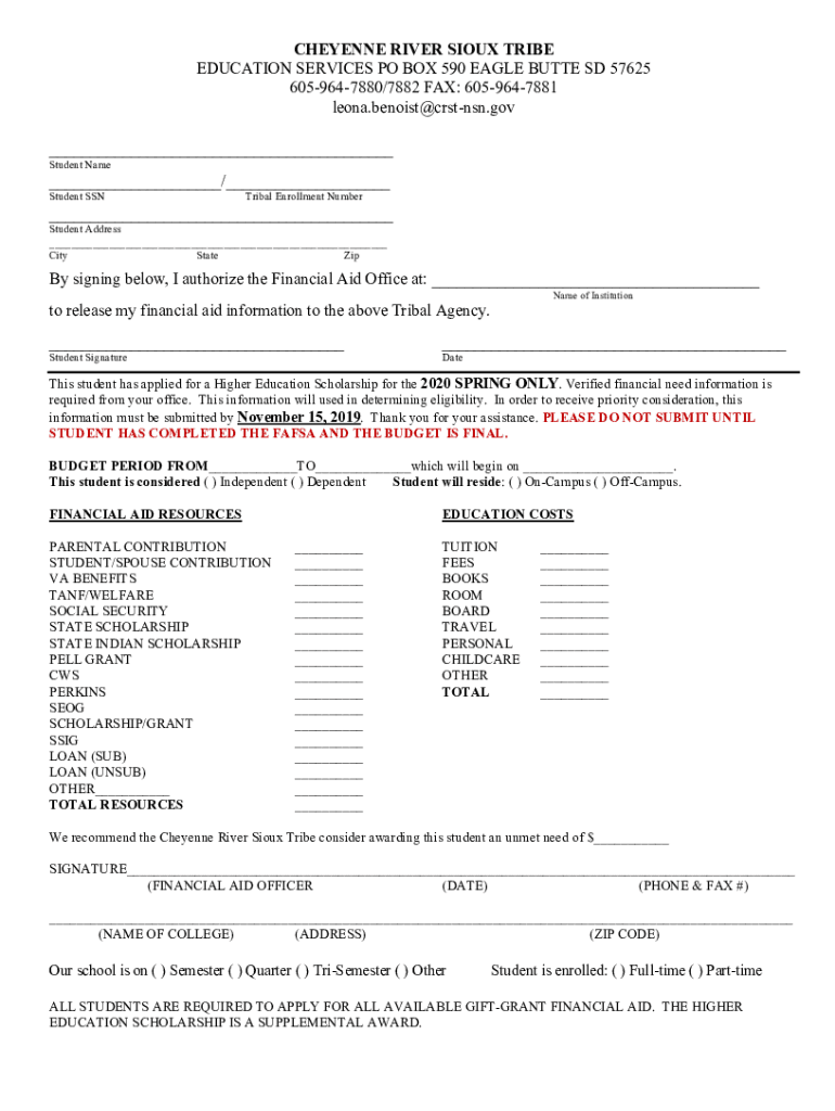 Get the free CHEYENNE RIVER SIOUX TRIBE EDUCATION SERVICES PO BOX 590 ...