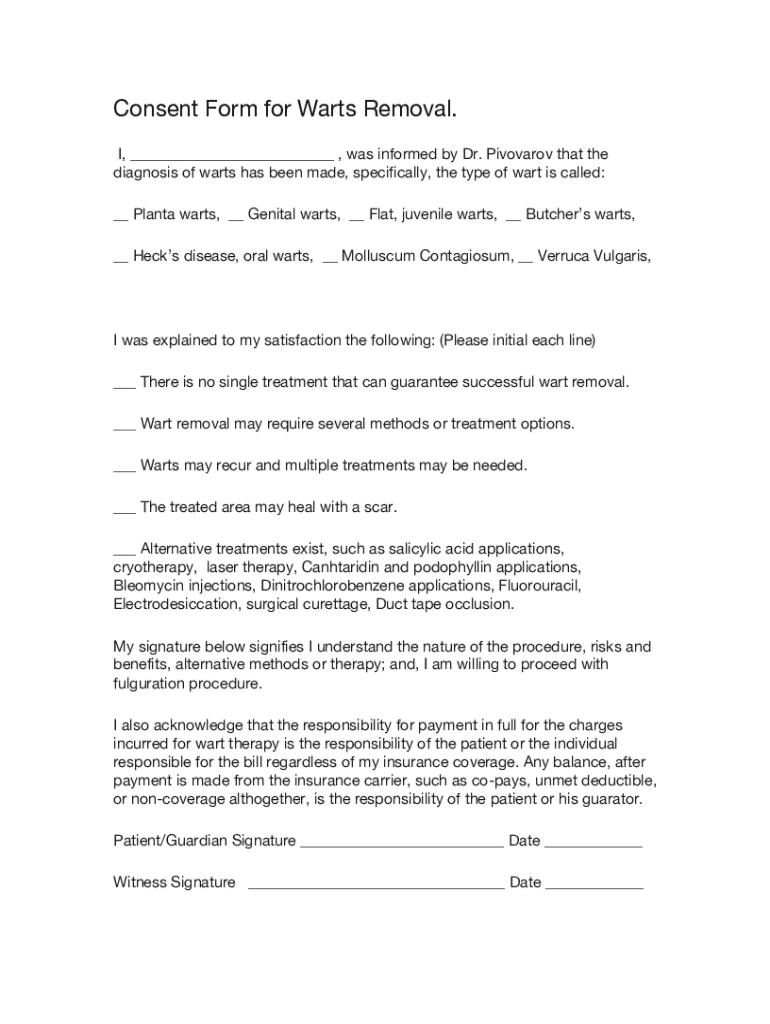 The form should be signed by the patient or, if the patient is a minor, the guardian. It’s crucial that those signing have the authority to consent for the wart removal procedure.