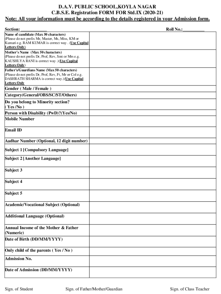 D.A.V. PUBLIC SCHOOL, KOALA NAGAR C.B.S.E. Registration FORM FOR Std. IX (202021) Note: All your information must be according to the details registered in your Admission form. Section: Roll No.: