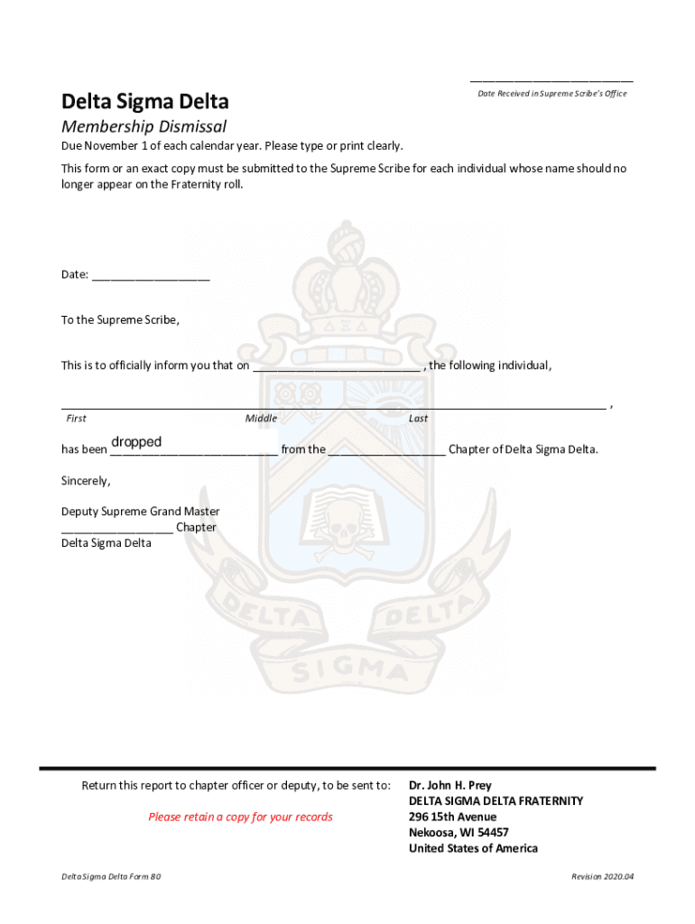 Date Received in Supreme Scribes Office Delta Sigma Delta Membership Dismissal Due November 1 of each calendar year. Please type or print clearly. This form or an exact copy must be submitted to the