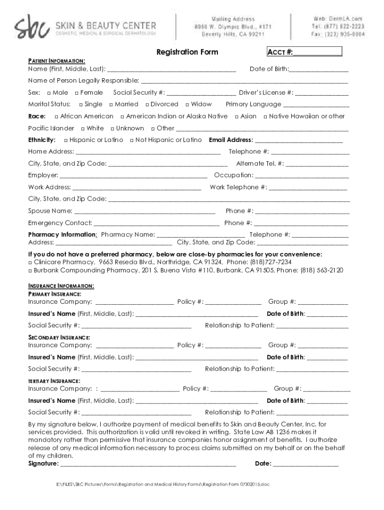 Registration Format #: PATIENT INFORMATION: Name (First, Middle, Last): Date of Birth: Name of Person Legally Responsible: Sex: Malarial Status: Race: Female SingleSocial Security #: Driver's License