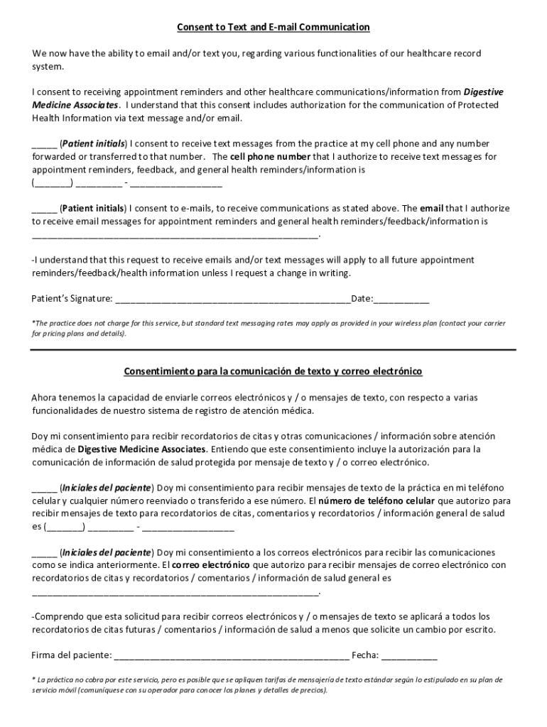 Consent to Text and Email Communication We now have the ability to email and/or text you, regarding various functionalities of our healthcare record system. I consent to receiving appointment reminders