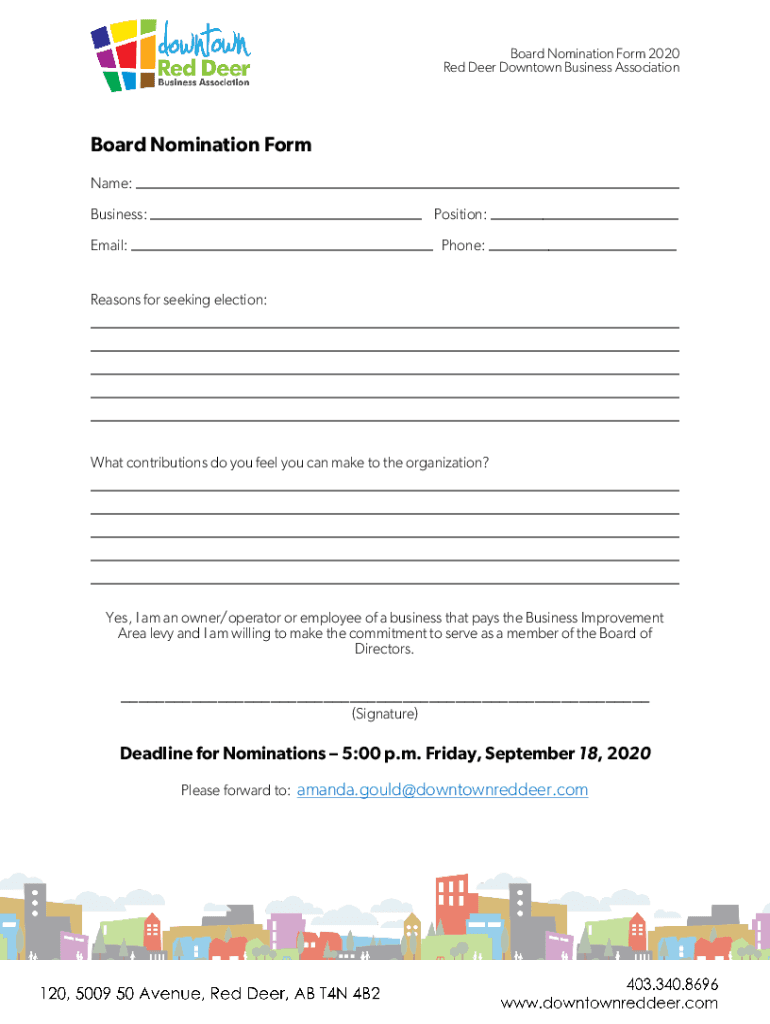 Board Nomination Form 2020 Red Deer Downtown Business AssociationBoard Nomination Form Name: Business: Position: Email: Phone: Reasons for seeking election: What contributions do you feel you can