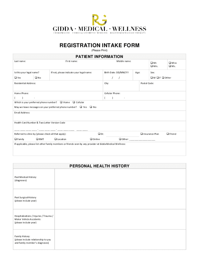 REGISTRATION INTAKE FORM (Please Print)PATIENT INFORMATION Last name:First name:Is this your legal name? Middle name:If not, please indicate your legal name:Birth Date: DD/MM/BY No/ City:Home Phone:Cellular