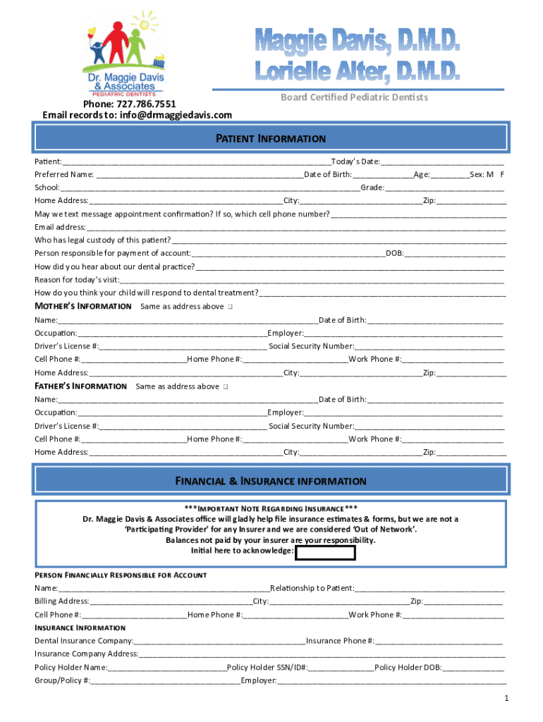 Phone: 727.786.7551 Email records to: info drmaggiedavis. Onboard Certified Pediatric DentistsPatient Information Patient: Today's Date: Preferred Name: Date of Birth: Age: Sex: M F School: Grade: