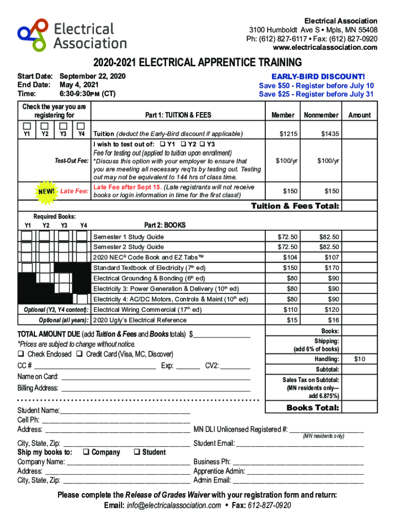 Electrical Association 3100 Humboldt Ave S MPLS, MN 55408 pH: (612) 8276117 Fax: (612) 8270920 www.electricalassociation.com20202021 ELECTRICAL APPRENTICE TRAINING Start Date:September 22, 2020, End