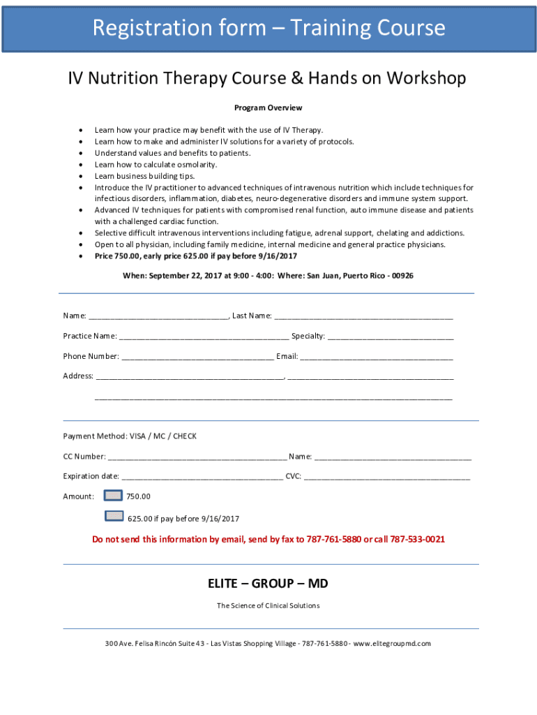 Registration form Training Course IV Nutrition Therapy Course & Hands-on Workshop Program Overview Learn how your practice may benefit with the use of IV Therapy. Learn how to make and administer