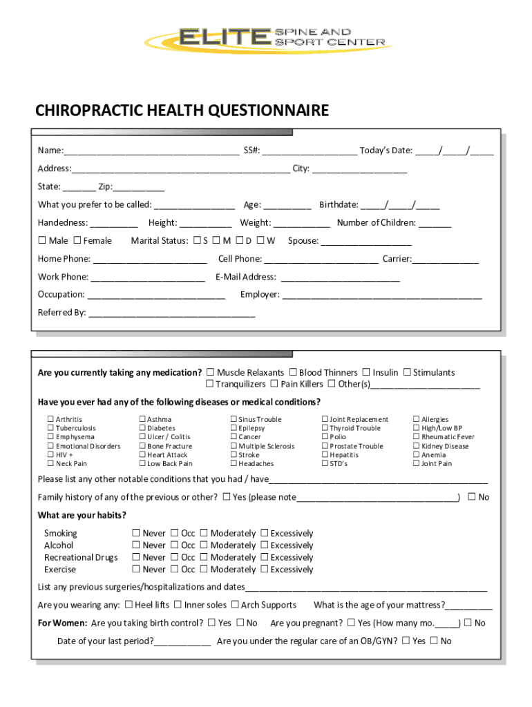 CHIROPRACTIC HEALTH QUESTIONNAIRE Name: SS#: Today's Date: / / Address: City: State: Zip: What you prefer to be called: Age: Birthdate: / / Handedness: Male FemaleHeight: Weight: Number of Children: