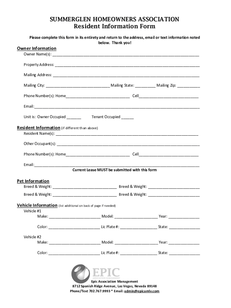 SUMMERLIN HOMEOWNERS ASSOCIATION Resident Information Form Please complete this form in its entirety and return to the address, email or text information noted below. Thank you! Owner Information