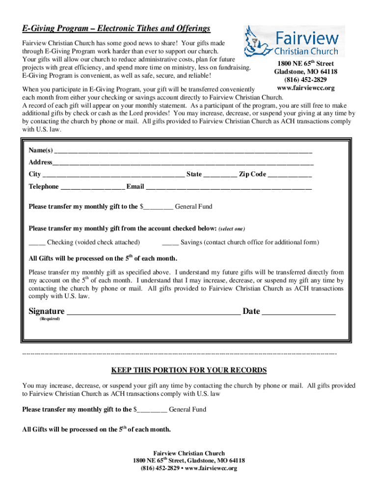 Giving Program Electronic Tithes and Offerings Fairview Christian Church has some good news to share! Your gifts made through Giving Program work harder than ever to support our church. Your gifts