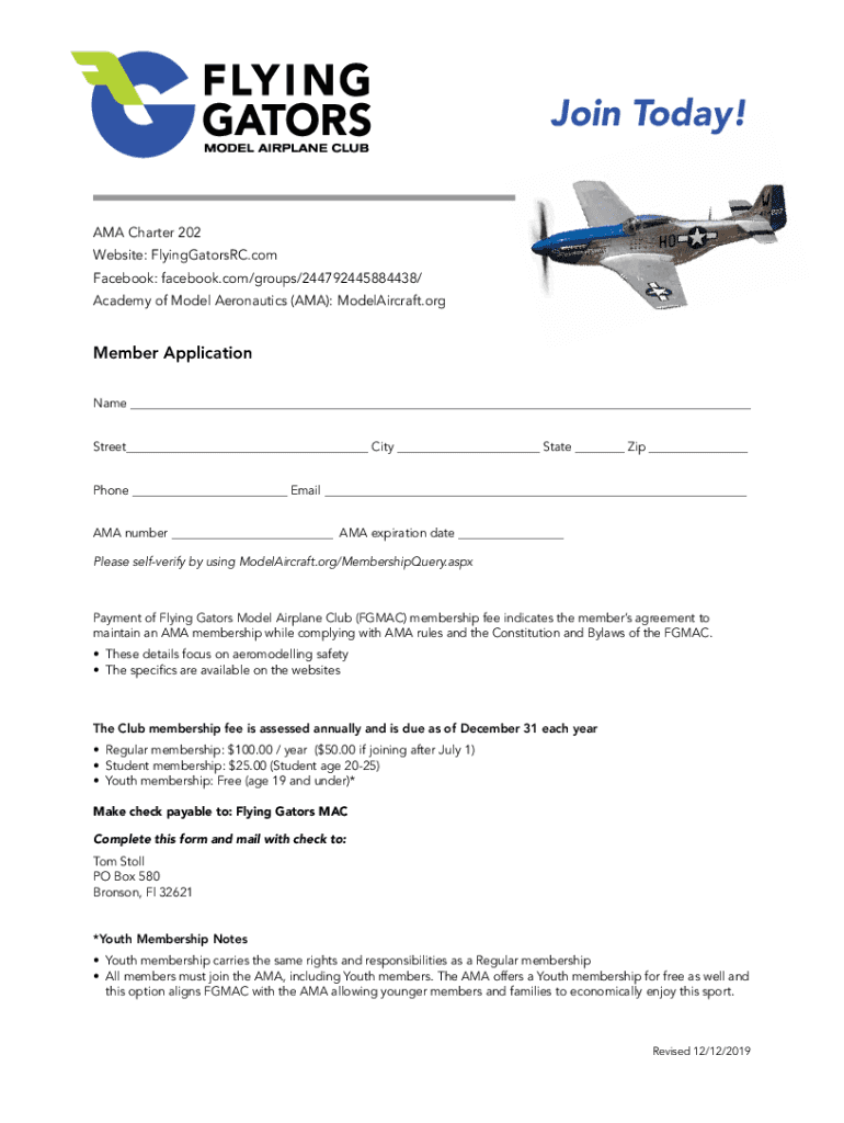 Join Today! AMA Charter 202 Website: FlyingGatorsRC.com Facebook: facebook.com/groups/244792445884438/ Academy of Model Aeronautics (AMA): ModelAircraft. Remember Application Name Street City State