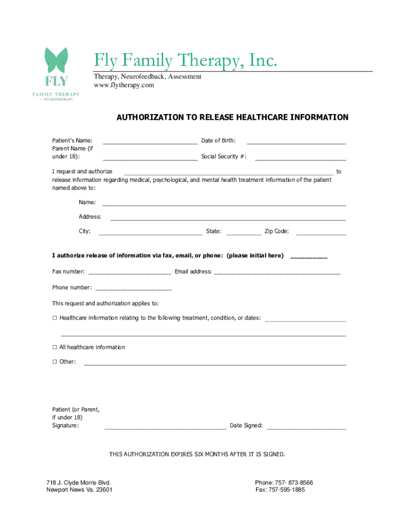 Fly Family Therapy, Inc. Therapy, Neurofeedback, Assessment www.flytherapy.comAUTHORIZATION TO RELEASE HEALTHCARE INFORMATION Patients Name: Parent Name (if under 18):Date of Birth: Social Security