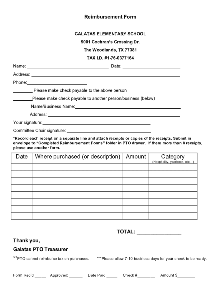 Reimbursement Form PALATAL ELEMENTARY SCHOOL 9001 Cochrans Crossing Dr. The Woodlands, TX 77381 TAX I.D. #1760377164 Name: Date: Address: Phone: Please make check payable to the above person Please