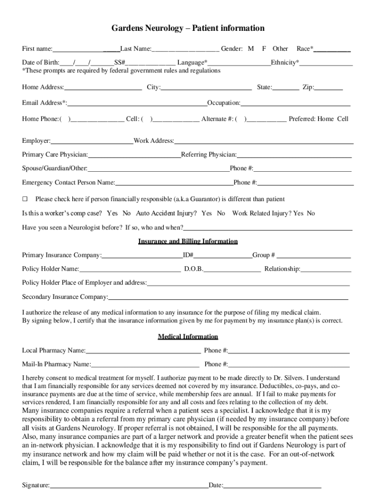 Gardens Neurology Patient information First name: Last Name: Gender: MF Operate of Birth: / / SS# Language* *These prompts are required by federal government rules and regulations Home Address:Race*