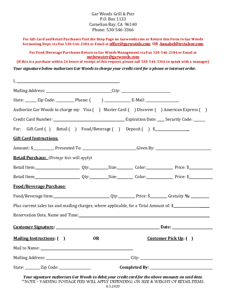 Gar Woods Grill & Pier P.O. Box 1133 Carnelian Bay, CA 96140 Phone: 5305463366 For Gift Card and Retail Purchases Visit the Shop Page on Garwoods.com or Return this Form to Gar Woods Accounting Dept.