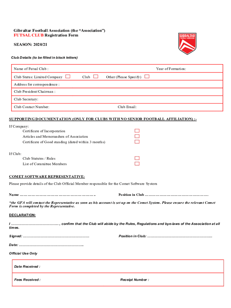 Obtain the 20-21 futsal club registration form from the respective authority or organization.