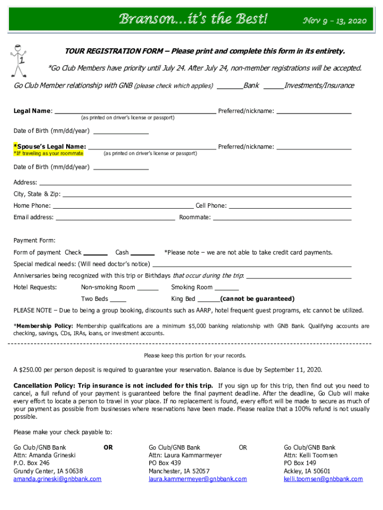 Transmits the Best! Nov 9 13, 2020TOUR REGISTRATION FORM Please print and complete this form in its entirety. *Go Club Members have priority until July 24. After July 24, nonmember registrations will