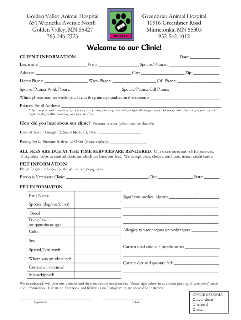 Golden Valley Animal Hospital 651 Winnetka Avenue North Golden Valley, MN 55427 7635462323Greenbrier Animal Hospital 10916 Greenbrier Road Minnetonka, MN 55305 9525421012Welcome to our Clinic! CLIENT