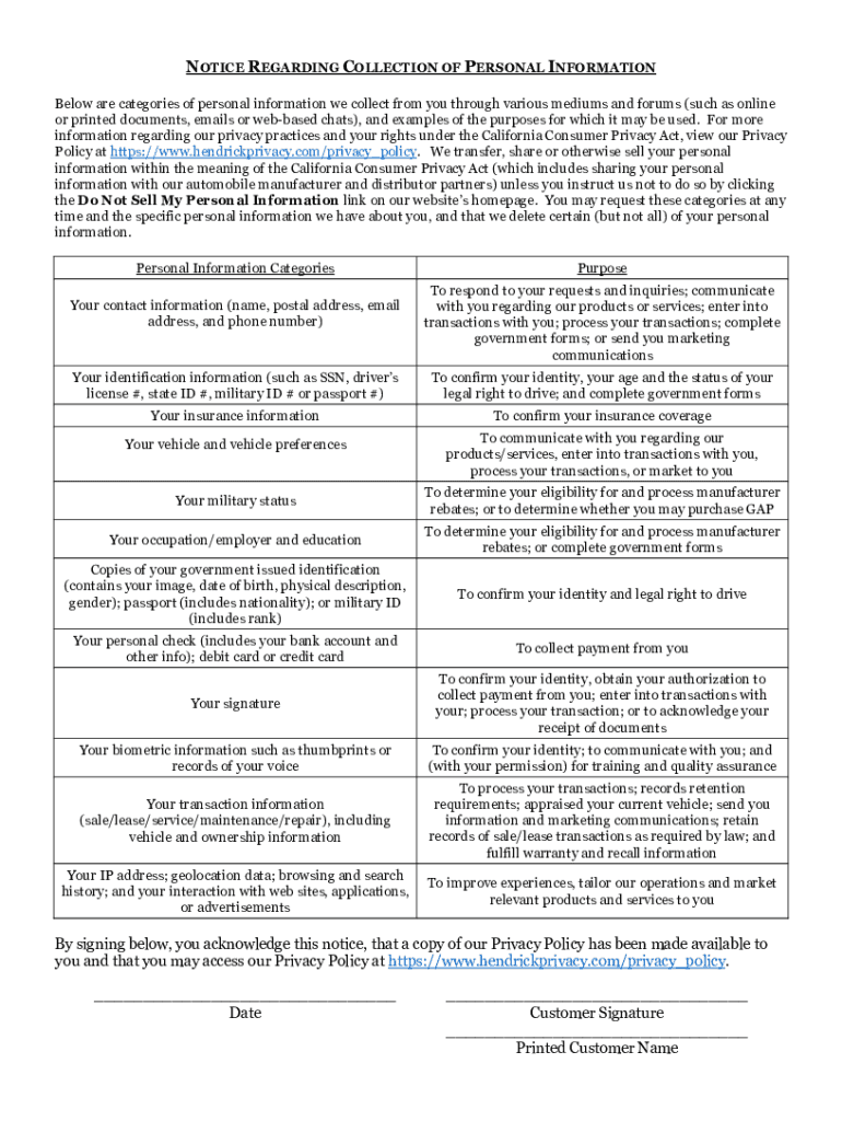 NOTICE REGARDING COLLECTION OF PERSONAL INFORMATION