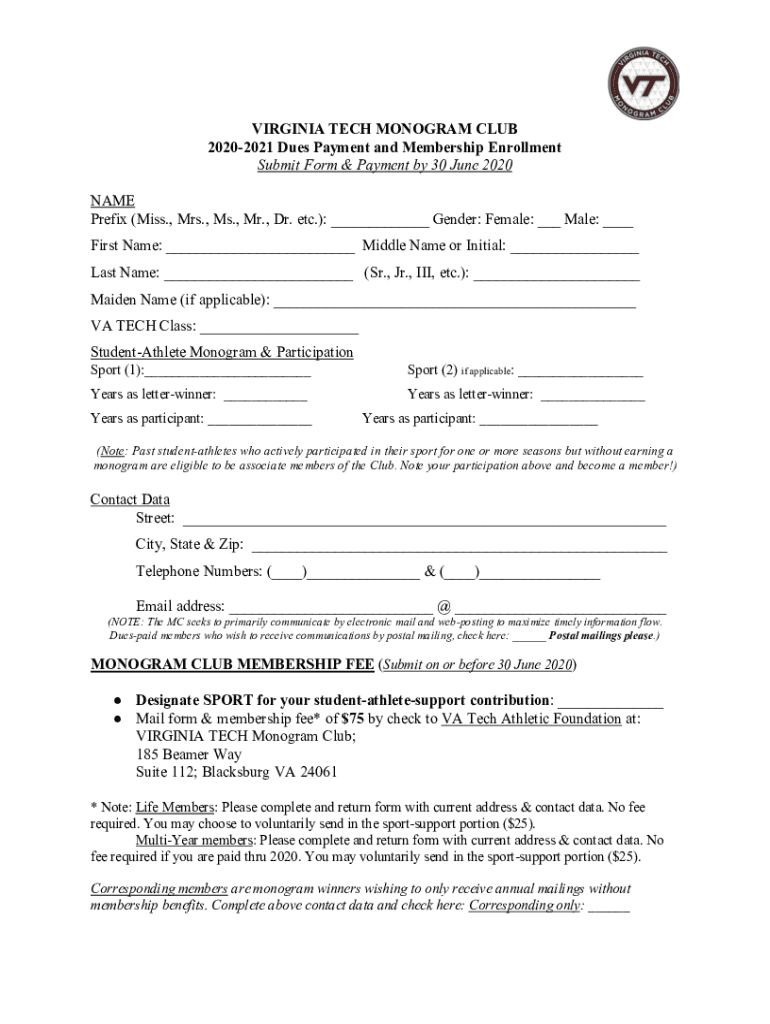 VIRGINIA TECH MONOGRAM CLUB 20202021 Dues Payment and Membership Enrollment Submit Form & Payment by 30 June 2020 NAME Prefix (Miss., Mrs., Ms., Mr., Dr. etc.): Gender: Female: Male: First Name: Middle