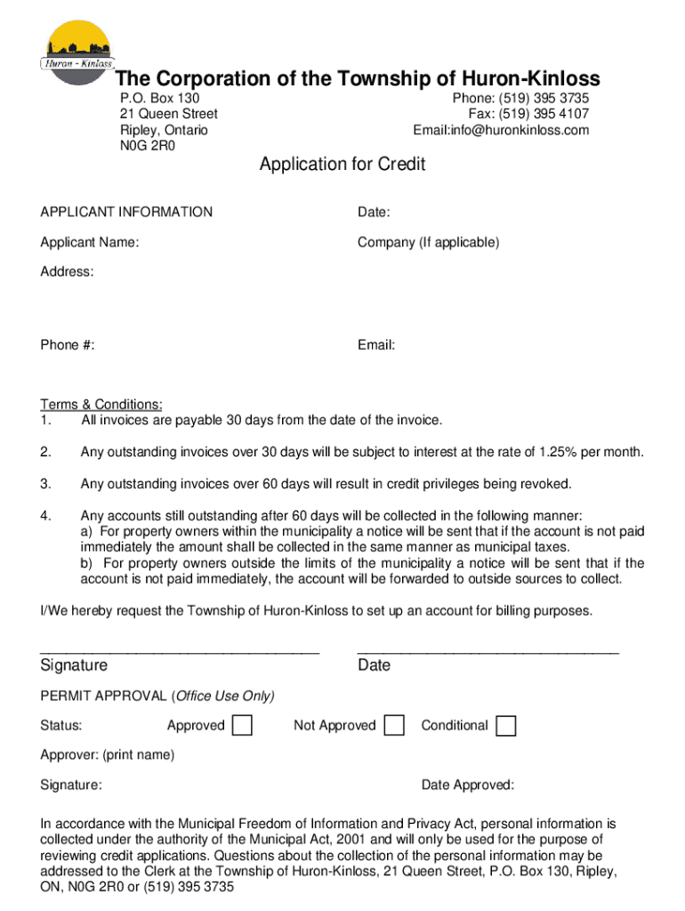 The Corporation of the Township of HuronKinloss P.O. Box 130 21 Queen Street Ripley, Ontario N0G 2R0Phone: (519) 395 3735 Fax: (519) 395 4107 Email:info huronkinloss. Complication for Credit APPLICANT